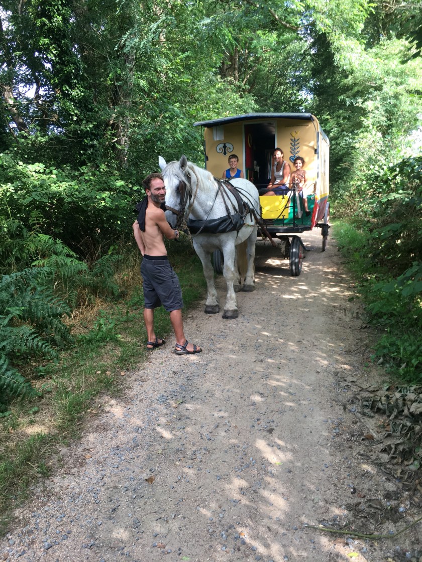 Now you aren’t going to believe the next bit … Carol has a habit of singing songs in her head as she cycles along (alleviates the boredom allegedly). As we were on a former rail line and going downhill at some speed, the children’s favourite of ‘The Runaway Train Came Over the Hill’ came into her head. We then proceeded to have a conversation about other childhood favourites such as ‘A Mouse Lived in a Windmill’, ‘Tubby the Tuba’ and other kids songs that used to come on ‘Children’s Favourites’ on Saturday morning radio. (You younger readers wont remember any of this). Then I said a regular favourite that came on every week was ‘Four Wheels On My Waggon’ a song in which progressively all four wheels on the ‘ole covered waggon (driven by the great pioneers of the Wild West crossing the prairie) come off as the Cherokees start circling round. Can’t remember whether this song has a grisly ending or not but just as we are giving big licks and singing ” higgardy hoggardy haggerdi hi” what should roll round the corner on the ‘ ole railway line is a bl**dy covered waggon pulled by a horse with a family of four aboard. We wet ourselves in amazement at this ludicrous coincidence and thought ‘no-one is going to believe this rubbish, but it’s true. Here’s the wagon pulled by Kilo the horse on its way up the track.