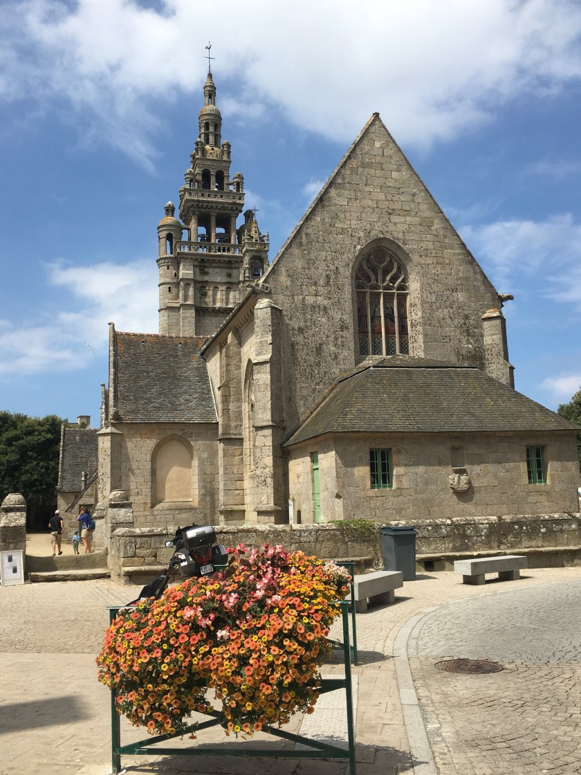 PS. We eventually found a church without scaffolding around it!! It is L’Eglise Notre Dame de Croas Batz in Roscoff. It may not have scaffolding but it appears to have a tower topped off with a giant granite wedding cake and to be supported solely by a hunchback smoking a pipe!!